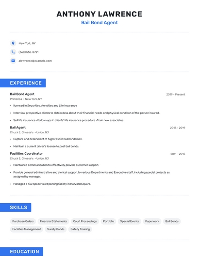 Build a professional bail bond agent resume in minutes. Browse through our resume examples to identify the best way to word your resume. Then choose from 5+ resume templates to create your bail bond agent resume.