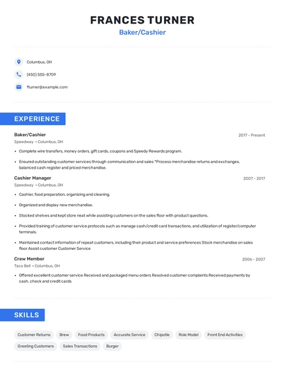 Build a professional baker/cashier resume in minutes. Browse through our resume examples to identify the best way to word your resume. Then choose from 5+ resume templates to create your baker/cashier resume.