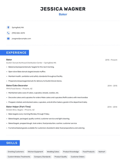 Build a professional baker resume in minutes. Browse through our resume examples to identify the best way to word your resume. Then choose from 5+ resume templates to create your baker resume.