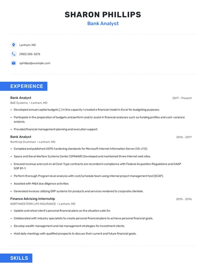 Build a professional bank analyst resume in minutes. Browse through our resume examples to identify the best way to word your resume. Then choose from 5+ resume templates to create your bank analyst resume.