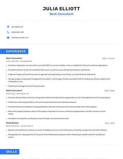 Build a professional bank consultant resume in minutes. Browse through our resume examples to identify the best way to word your resume. Then choose from 5+ resume templates to create your bank consultant resume.