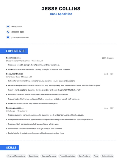 Build a professional bank specialist resume in minutes. Browse through our resume examples to identify the best way to word your resume. Then choose from 5+ resume templates to create your bank specialist resume.