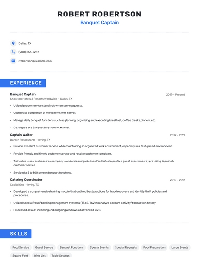 Build a professional banquet captain resume in minutes. Browse through our resume examples to identify the best way to word your resume. Then choose from 5+ resume templates to create your banquet captain resume.