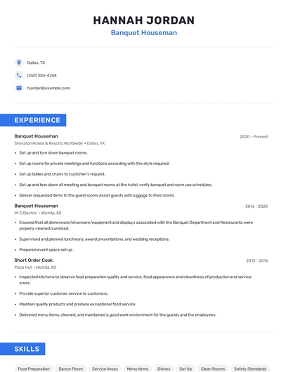 Build a professional banquet houseman resume in minutes. Browse through our resume examples to identify the best way to word your resume. Then choose from 5+ resume templates to create your banquet houseman resume.