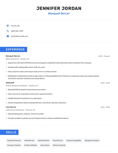 Build a professional banquet server resume in minutes. Browse through our resume examples to identify the best way to word your resume. Then choose from 5+ resume templates to create your banquet server resume.