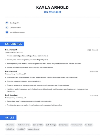Build a professional bar attendant resume in minutes. Browse through our resume examples to identify the best way to word your resume. Then choose from 5+ resume templates to create your bar attendant resume.