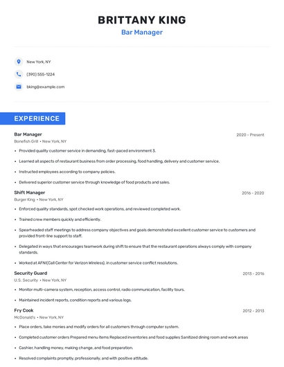 Build a professional bar manager resume in minutes. Browse through our resume examples to identify the best way to word your resume. Then choose from 5+ resume templates to create your bar manager resume.