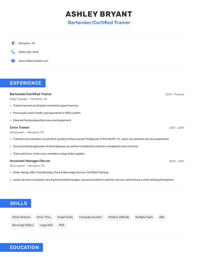 Choose from 10+ customizable bartender/certified trainer resume templates