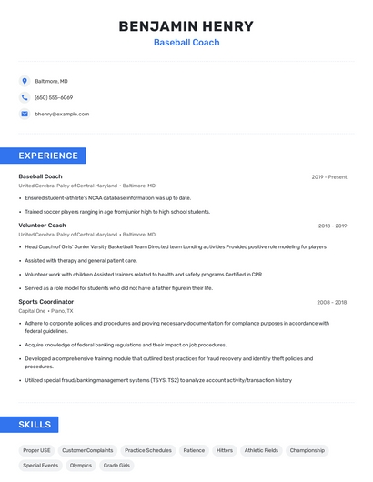 Build a professional baseball coach resume in minutes. Browse through our resume examples to identify the best way to word your resume. Then choose from 5+ resume templates to create your baseball coach resume.