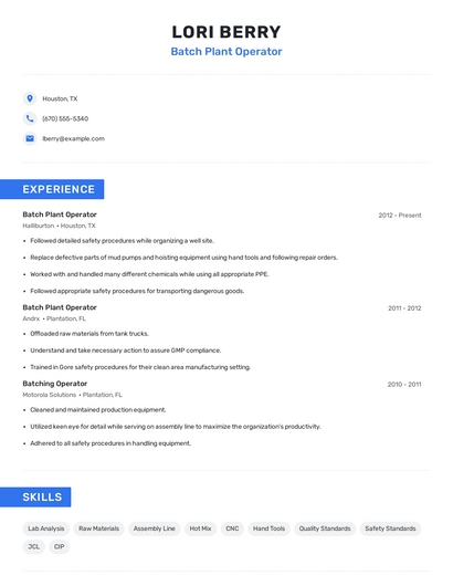 Build a professional batch plant operator resume in minutes. Browse through our resume examples to identify the best way to word your resume. Then choose from 5+ resume templates to create your batch plant operator resume.
