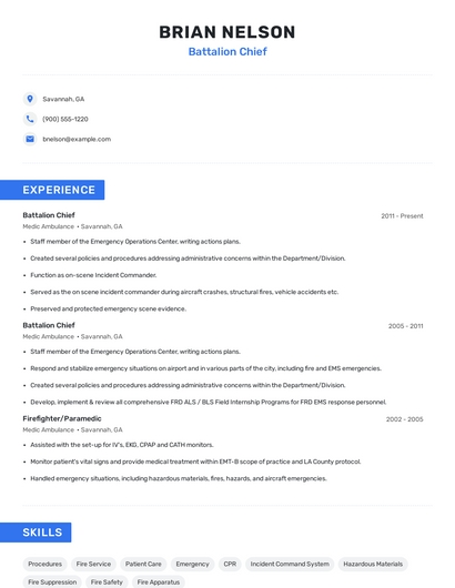 Build a professional battalion chief resume in minutes. Browse through our resume examples to identify the best way to word your resume. Then choose from 5+ resume templates to create your battalion chief resume.