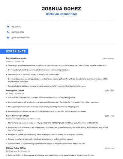 Build a professional battalion commander resume in minutes. Browse through our resume examples to identify the best way to word your resume. Then choose from 5+ resume templates to create your battalion commander resume.