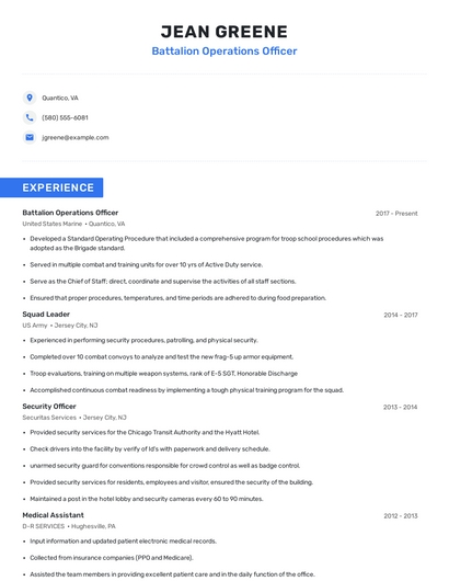 Build a professional battalion operations officer resume in minutes. Browse through our resume examples to identify the best way to word your resume. Then choose from 5+ resume templates to create your battalion operations officer resume.