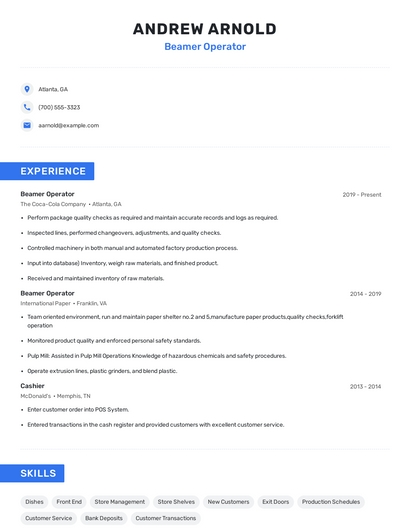 Build a professional beamer operator resume in minutes. Our AI resume writing assistant will guide you through every step of the process, and you can choose from 10+ resume templates to create your beamer operator resume.What skills help Beamer Operators find jobs?
