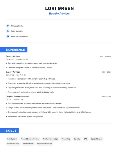 Build a professional beauty advisor resume in minutes. Browse through our resume examples to identify the best way to word your resume. Then choose from 5+ resume templates to create your beauty advisor resume.
