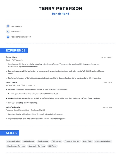 Build a professional bench hand resume in minutes. Our AI resume writing assistant will guide you through every step of the process, and you can choose from 10+ resume templates to create your bench hand resume.7. Plastic Injection