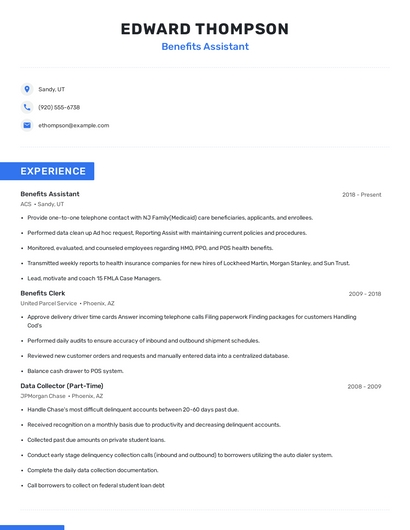 Build a professional benefits assistant resume in minutes. Browse through our resume examples to identify the best way to word your resume. Then choose from 5+ resume templates to create your benefits assistant resume.