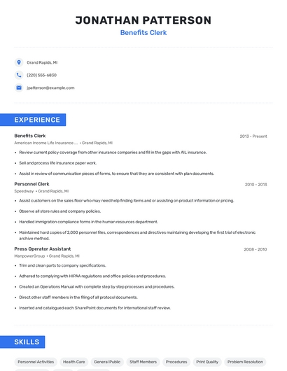 Build a professional benefits clerk resume in minutes. Our AI resume writing assistant will guide you through every step of the process, and you can choose from 10+ resume templates to create your benefits clerk resume.7. Life Insurance