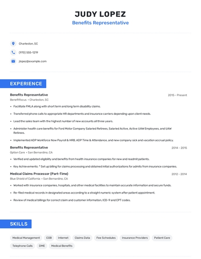 Build a professional benefits representative resume in minutes. Browse through our resume examples to identify the best way to word your resume. Then choose from 5+ resume templates to create your benefits representative resume.