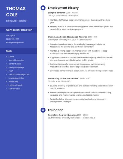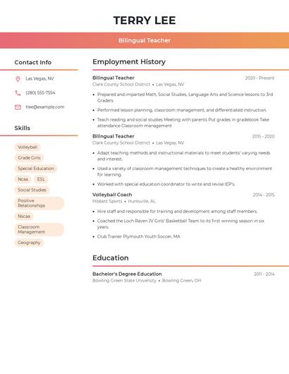 You can use Zippia's AI resume builder to make the resume writing process easier while also making sure that you include key information that hiring managers expect to see on a bilingual teacher resume. You'll find resume tips and examples of skills, responsibilities, and summaries, all provided by Zippi, your career sidekick.