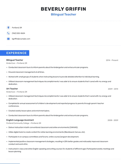 Build a professional bilingual teacher resume in minutes. Browse through our resume examples to identify the best way to word your resume. Then choose from 5+ resume templates to create your bilingual teacher resume.
