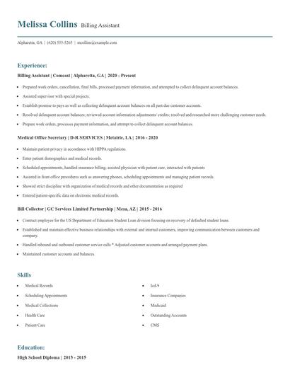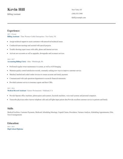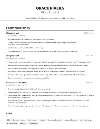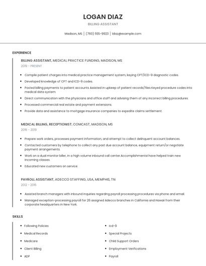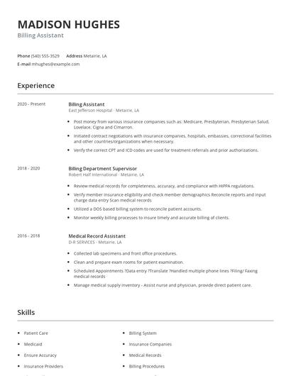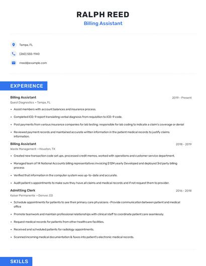 You can use Zippia's AI resume builder to make the resume writing process easier while also making sure that you include key information that hiring managers expect to see on a billing assistant resume. You'll find resume tips and examples of skills, responsibilities, and summaries, all provided by Zippi, your career sidekick.
