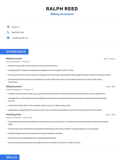 Build a professional billing assistant resume in minutes. Browse through our resume examples to identify the best way to word your resume. Then choose from 5+ resume templates to create your billing assistant resume.