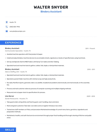 Build a professional bindery assistant resume in minutes. Browse through our resume examples to identify the best way to word your resume. Then choose from 5+ resume templates to create your bindery assistant resume.