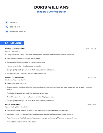 The most important skills for a bindery cutter operator resume and required skills for a bindery cutter operator to have include: