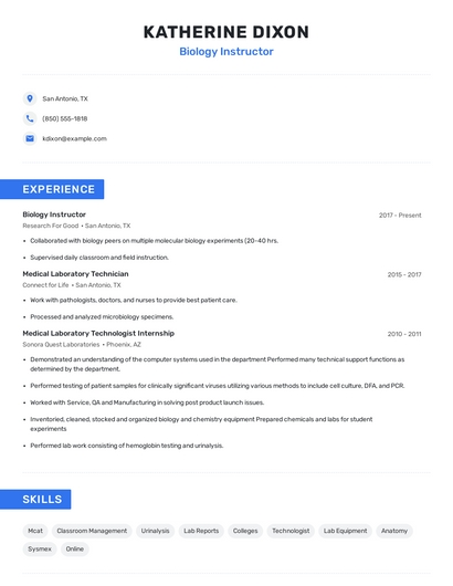 Build a professional biology instructor resume in minutes. Browse through our resume examples to identify the best way to word your resume. Then choose from 5+ resume templates to create your biology instructor resume.