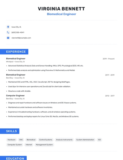 Build a professional biomedical engineer resume in minutes. Browse through our resume examples to identify the best way to word your resume. Then choose from 5+ resume templates to create your biomedical engineer resume.