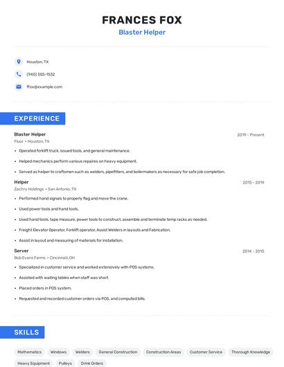 Build a professional blaster helper resume in minutes. Our AI resume writing assistant will guide you through every step of the process, and you can choose from 10+ resume templates to create your blaster helper resume.What skills help Blaster Helpers find jobs?