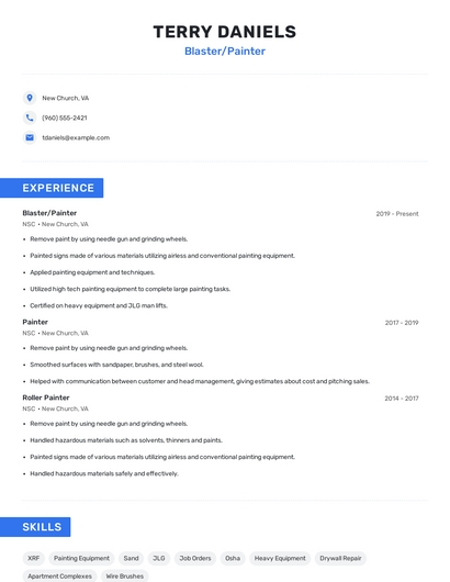 Build a professional blaster/painter resume in minutes. Browse through our resume examples to identify the best way to word your resume. Then choose from 5+ resume templates to create your blaster/painter resume.