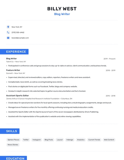 Build a professional blog writer resume in minutes. Browse through our resume examples to identify the best way to word your resume. Then choose from 5+ resume templates to create your blog writer resume.