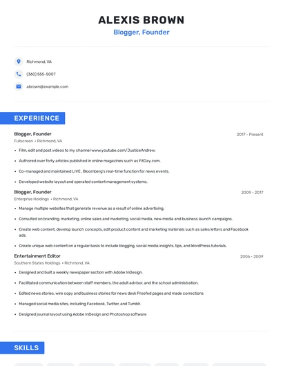 Build a professional blogger, founder resume in minutes. Browse through our resume examples to identify the best way to word your resume. Then choose from 5+ resume templates to create your blogger, founder resume.
