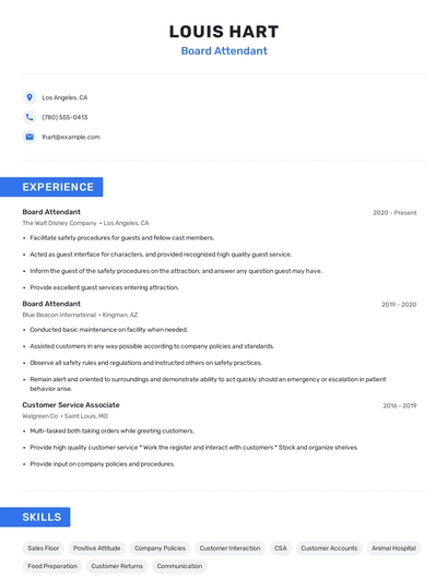 Build a professional board attendant resume in minutes. Our AI resume writing assistant will guide you through every step of the process, and you can choose from 10+ resume templates to create your board attendant resume.What skills help Board Attendants find jobs?