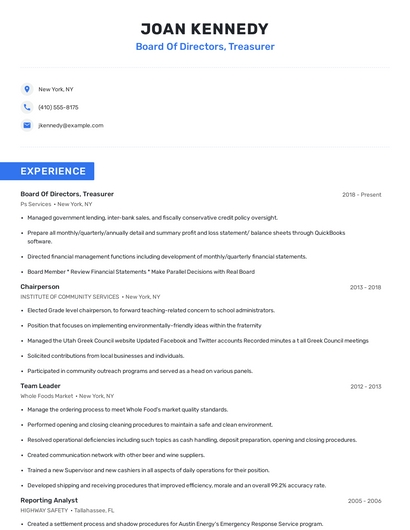 Choose from 10+ customizable board of directors, treasurer resume templates