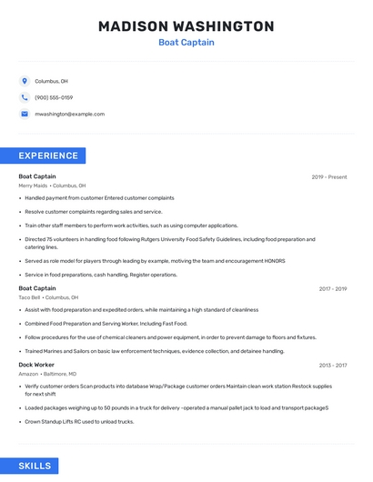Build a professional boat captain resume in minutes. Browse through our resume examples to identify the best way to word your resume. Then choose from 5+ resume templates to create your boat captain resume.