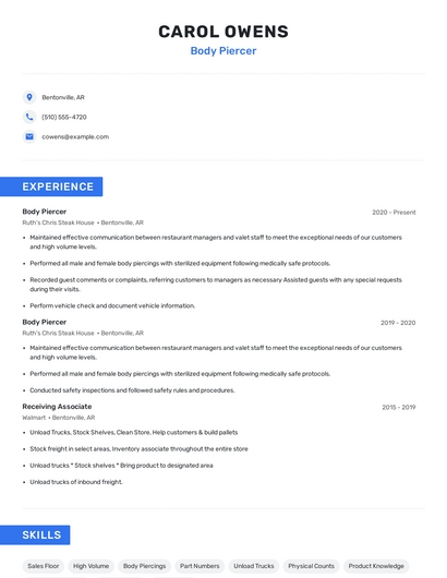 Build a professional body piercer resume in minutes. Our AI resume writing assistant will guide you through every step of the process, and you can choose from 10+ resume templates to create your body piercer resume.7. Consent Forms