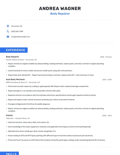 Build a professional body repairer resume in minutes. Our AI resume writing assistant will guide you through every step of the process, and you can choose from 10+ resume templates to create your body repairer resume.7. Power Grinders