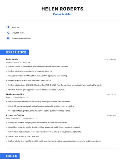 Build a professional boiler welder resume in minutes. Our AI resume writing assistant will guide you through every step of the process, and you can choose from 10+ resume templates to create your boiler welder resume.7. GMAW