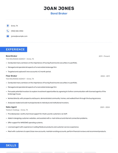 Build a professional bond broker resume in minutes. Browse through our resume examples to identify the best way to word your resume. Then choose from 5+ resume templates to create your bond broker resume.
