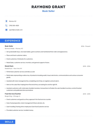 Build a professional book seller resume in minutes. Browse through our resume examples to identify the best way to word your resume. Then choose from 5+ resume templates to create your book seller resume.