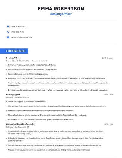 Build a professional booking officer resume in minutes. Browse through our resume examples to identify the best way to word your resume. Then choose from 5+ resume templates to create your booking officer resume.