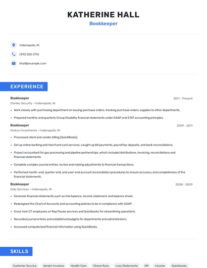 Build a professional bookkeeper resume in minutes. Browse through our resume examples to identify the best way to word your resume. Then choose from 5+ resume templates to create your bookkeeper resume.
