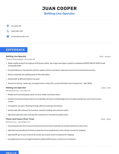 Build a professional bottling line operator resume in minutes. Our AI resume writing assistant will guide you through every step of the process, and you can choose from 10+ resume templates to create your bottling line operator resume.7. Quality Standards