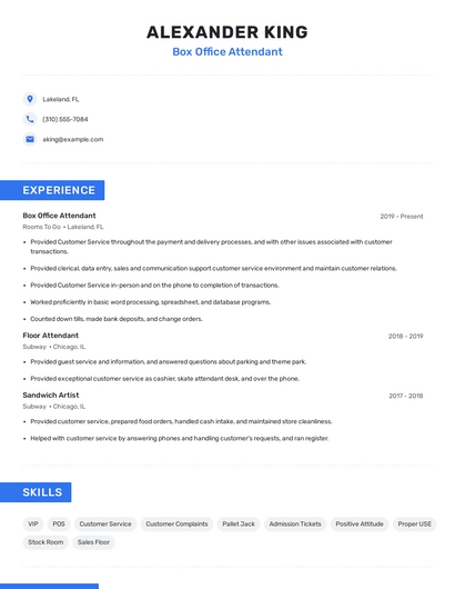 Build a professional box office attendant resume in minutes. Browse through our resume examples to identify the best way to word your resume. Then choose from 5+ resume templates to create your box office attendant resume.
