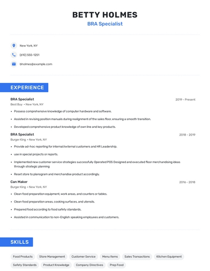 Build a professional bra specialist resume in minutes. Browse through our resume examples to identify the best way to word your resume. Then choose from 5+ resume templates to create your bra specialist resume.