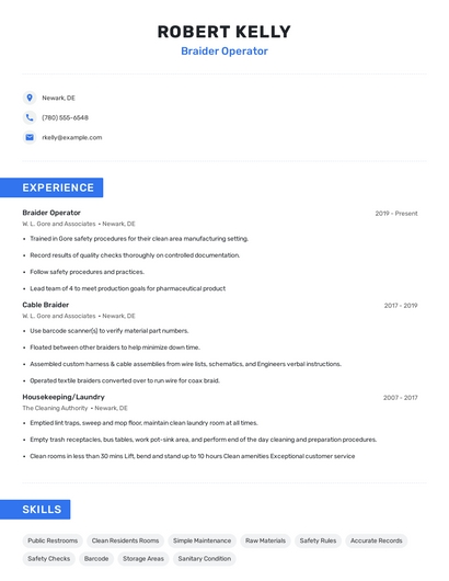 Build a professional braider operator resume in minutes. Our AI resume writing assistant will guide you through every step of the process, and you can choose from 10+ resume templates to create your braider operator resume.7. Customer Specifications