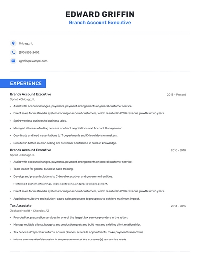Build a professional branch account executive resume in minutes. Browse through our resume examples to identify the best way to word your resume. Then choose from 5+ resume templates to create your branch account executive resume.